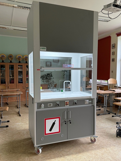 Dygestorium szkolne przeznaczone do prezentowania doświadczeń z substancjami chemicznymi podczas zajęć w szkolnych pracowniach chemicznych. Nauczyciel wykonuje eksperymenty w komorze dygestorium, a uczniowie mogą obserwować ich przebieg przez przeszklone szkłem bezpiecznym ściany komory.