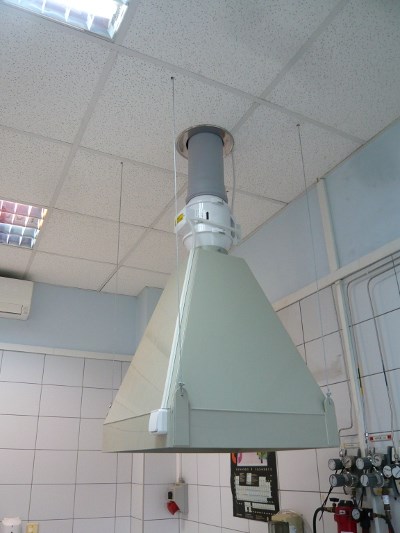 - Okap laboratoryjny / odciąg stanowiskowy sufitowy wykonany w całości z blachy stalowej OH18N9. Przystosowany do montażu pod sufitem. Zawieszony na wysięgnikach za pomocą linek stalowych.
