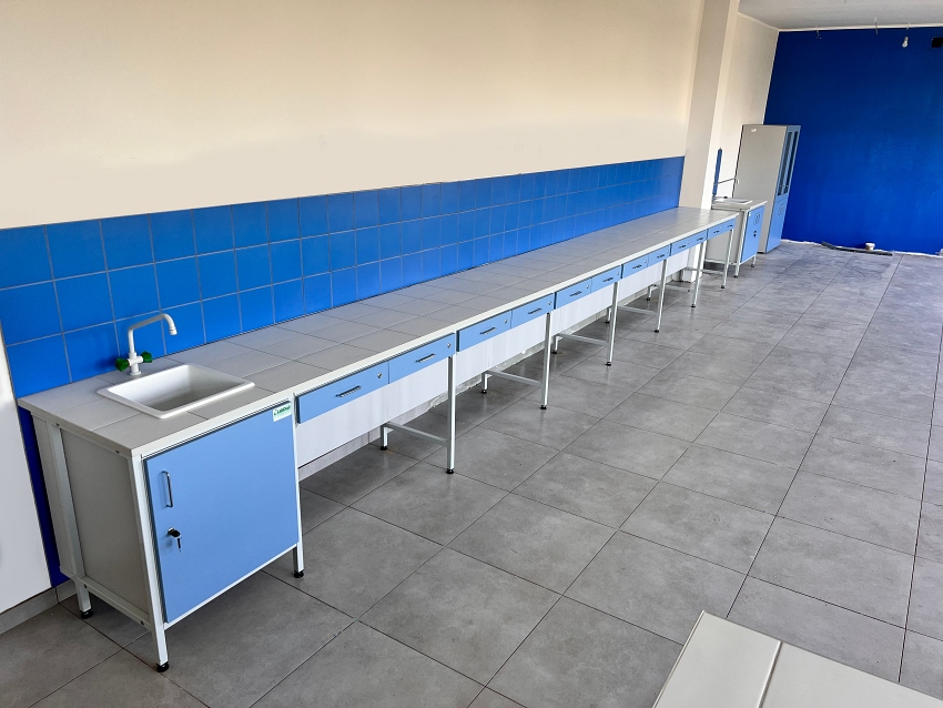 - Stół laboratoryjny przyścienny 12-osobowy do szkolnej pracowni chemicznej.