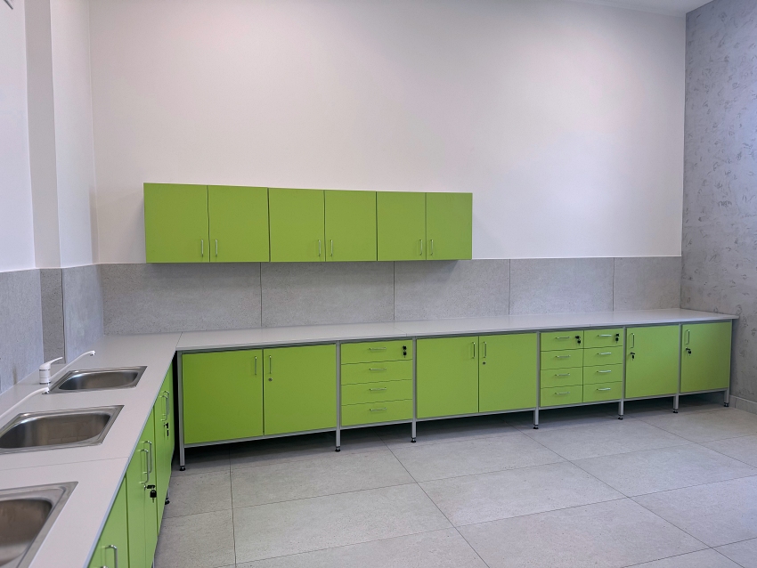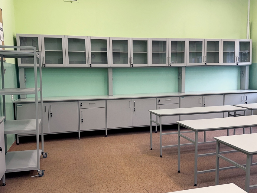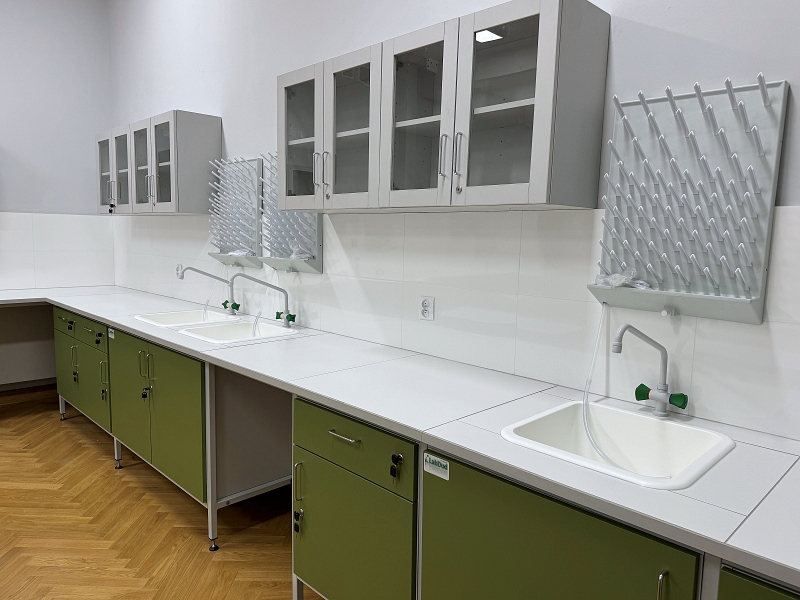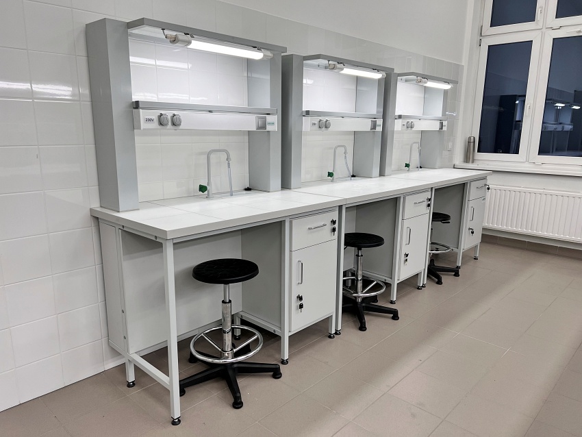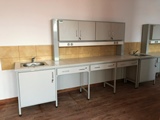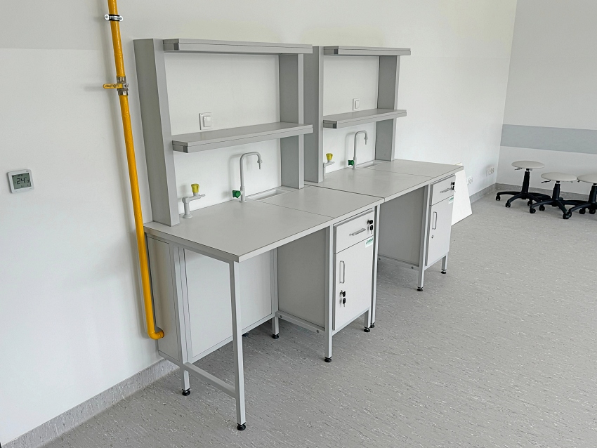 Stoły laboratoryjne przyścienne do wykonywania ćwiczeń w grupie, zabudowane na całej długości ściany.