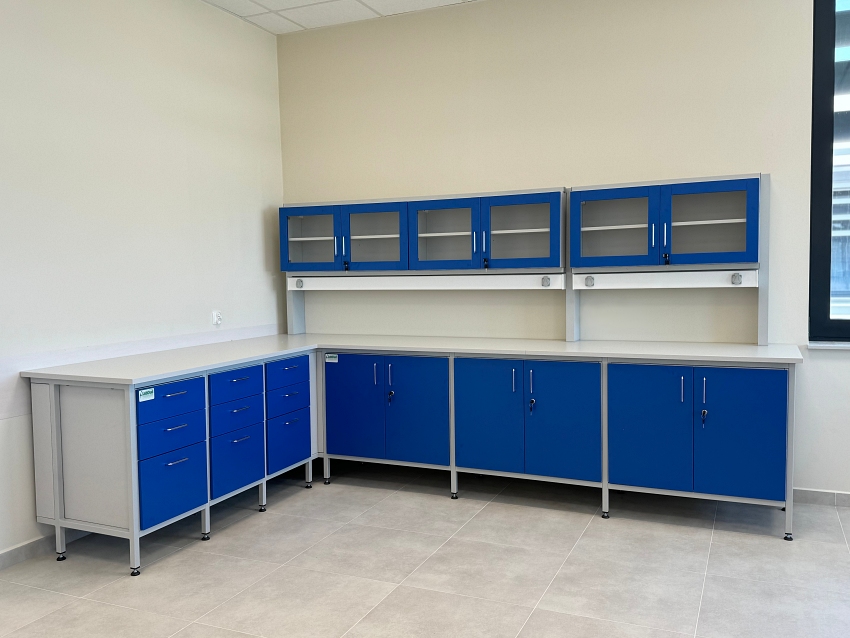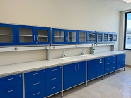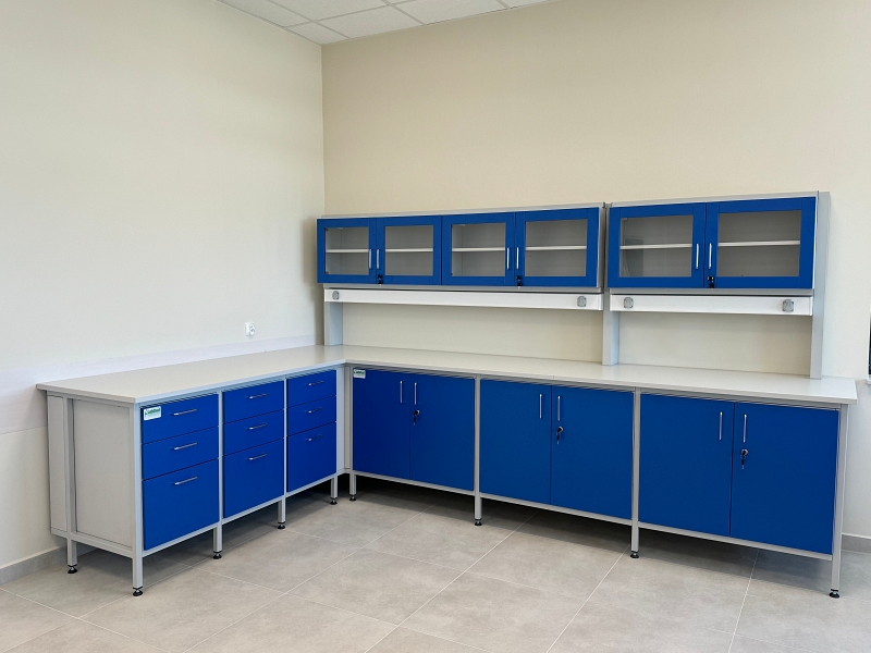 - Stół laboratoryjny przyścienny 4-osobowy z nadstawką szafkową do szkolnej pracowni chemicznej.