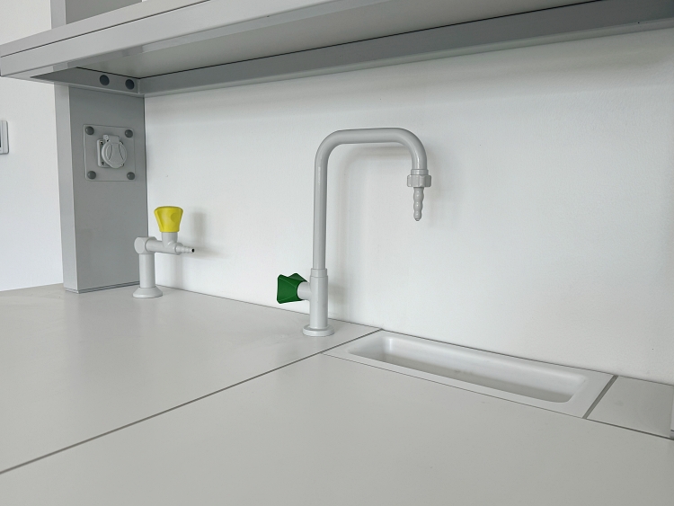 Przykładowe wyposażenie: bateria laboratoryjna z/ woda, zlewik ceramiczny, pojedynczy zawór gazu.