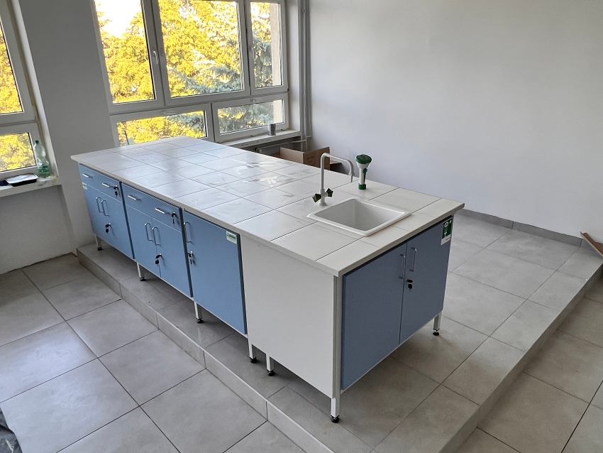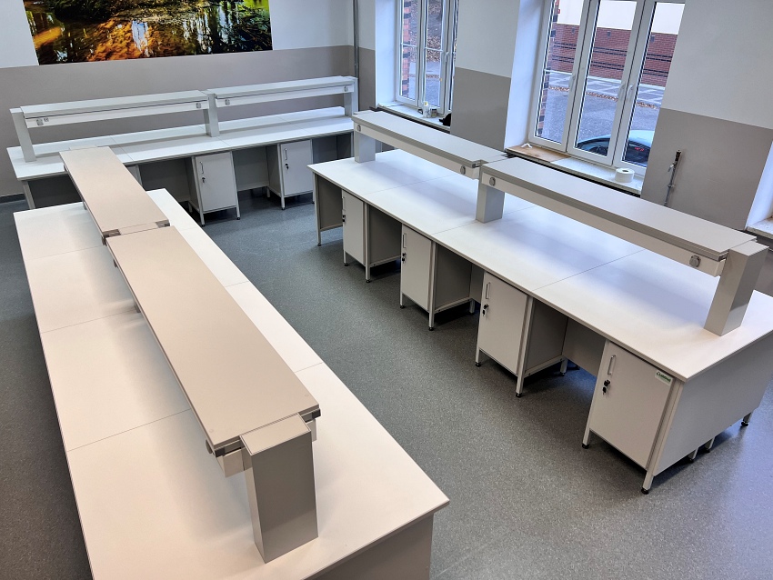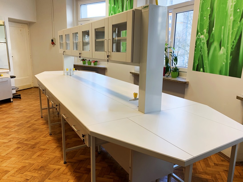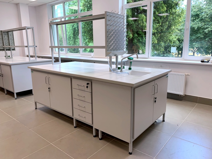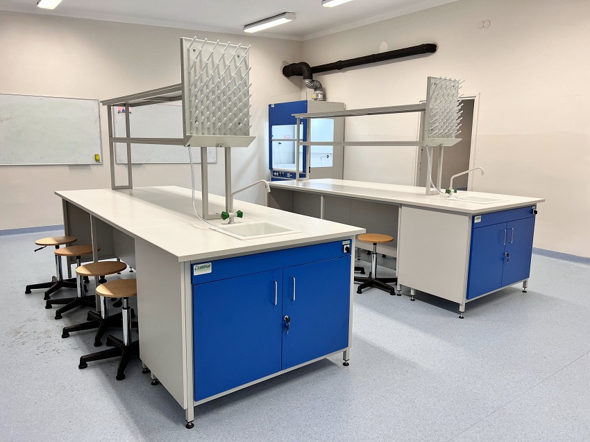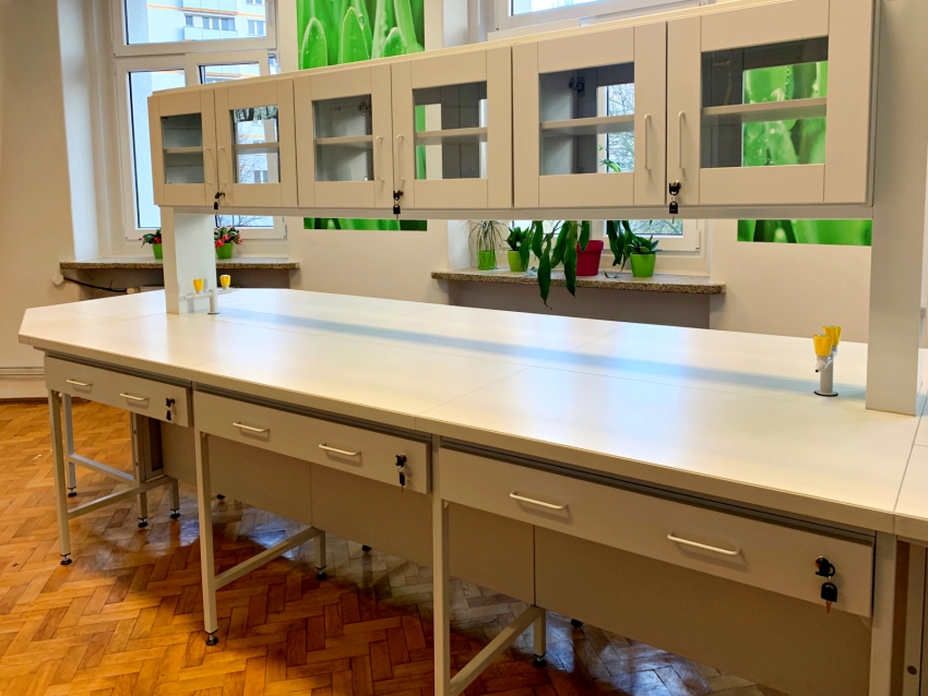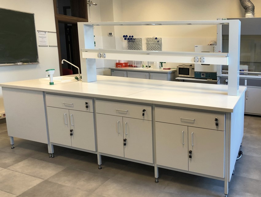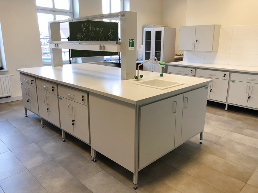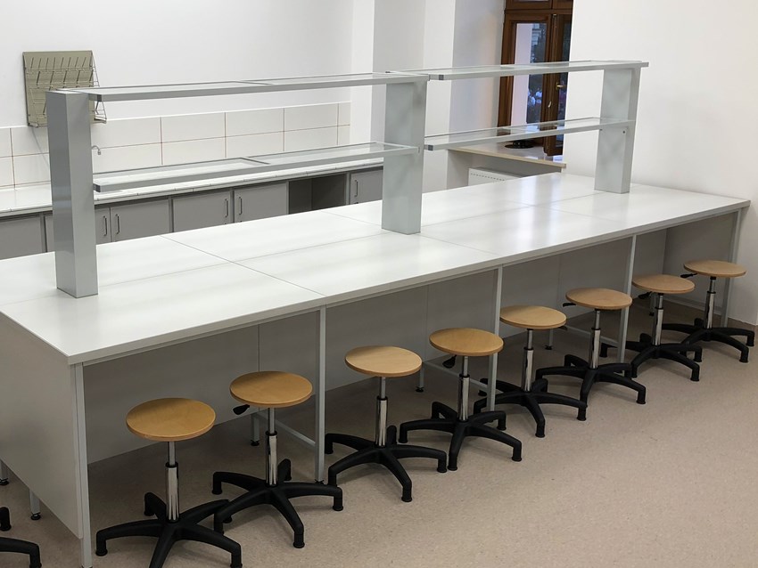 Blaty robocze stołów dopasowane są do rodzaju substancji chemicznych używanych w pracowni. Szafki oraz szuflady wykonane z laminatu o wzmocnionej strukturze z okleiną PCV 2mm, zamykane na zamki patentowe.