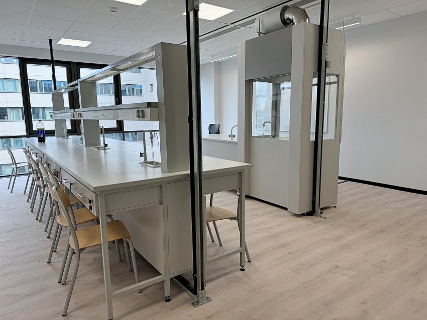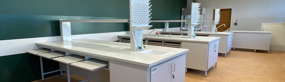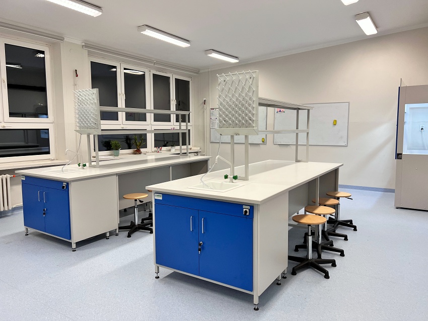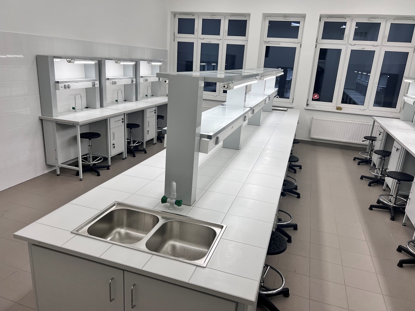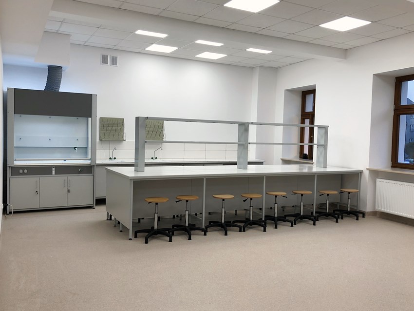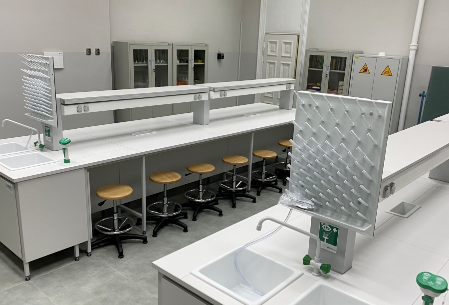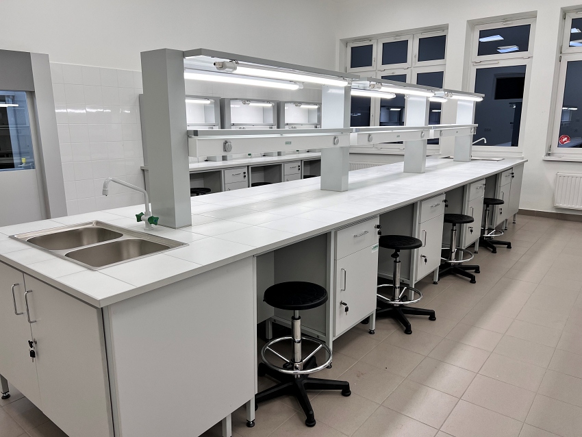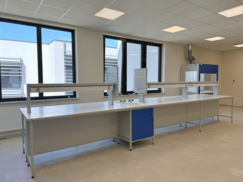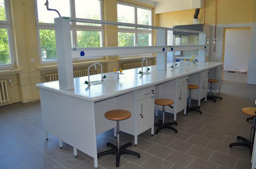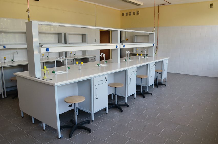Blaty robocze stołów dopasowane są do rodzaju substancji chemicznych używanych w pracowni. Szafki oraz szuflady wykonane z laminatu o wzmocnionej strukturze z okleiną PCV 2mm, zamykane na zamki patentowe.