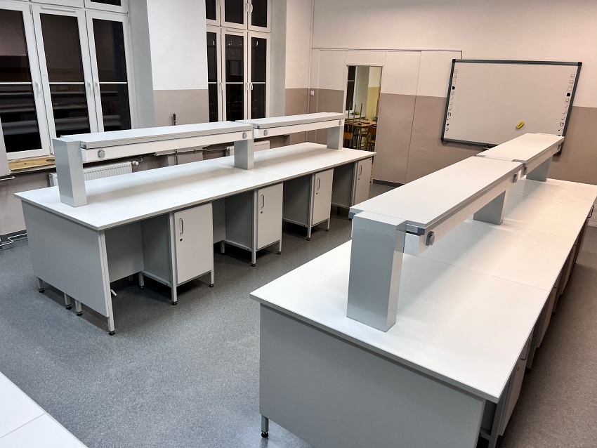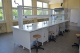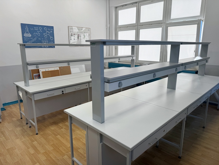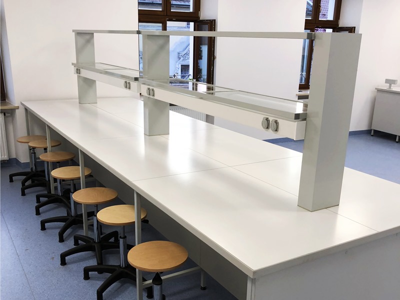 - Stoły laboratoryjne wyspowe 16-osobowe z nadstawką do szkolnej pracowni chemicznej.