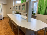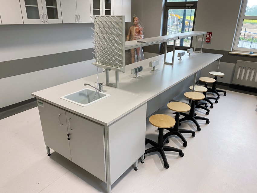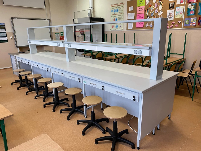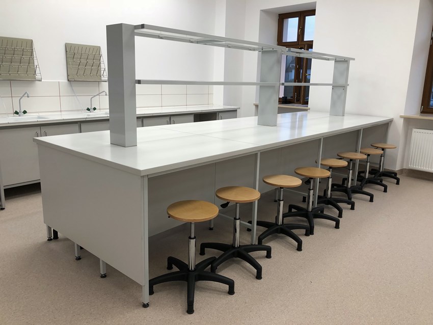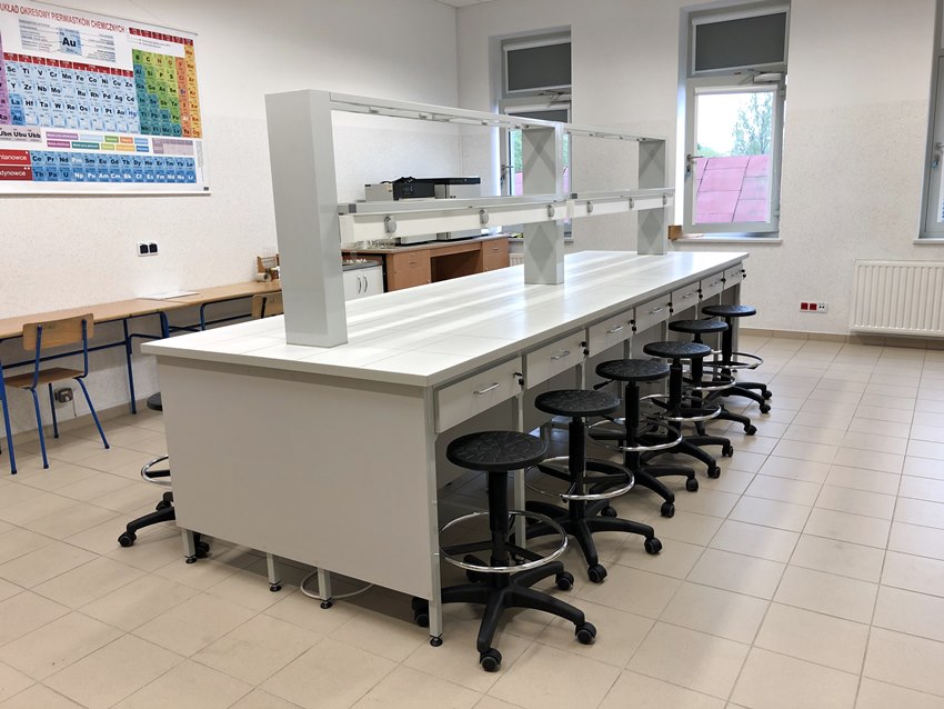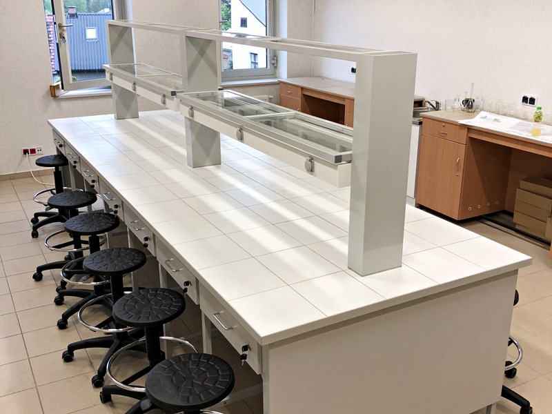 - Stoły laboratoryjne wyspowe 18-osobowe z nadstawką do szkolnych pracowni chemicznych.