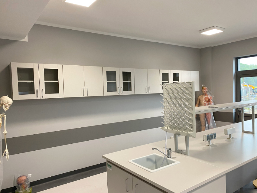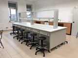 8 miejsc do siedzenia. Szafki z szufladą i drzwiczkami. Taborety laboratoryjne z podnóżkiem.