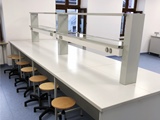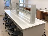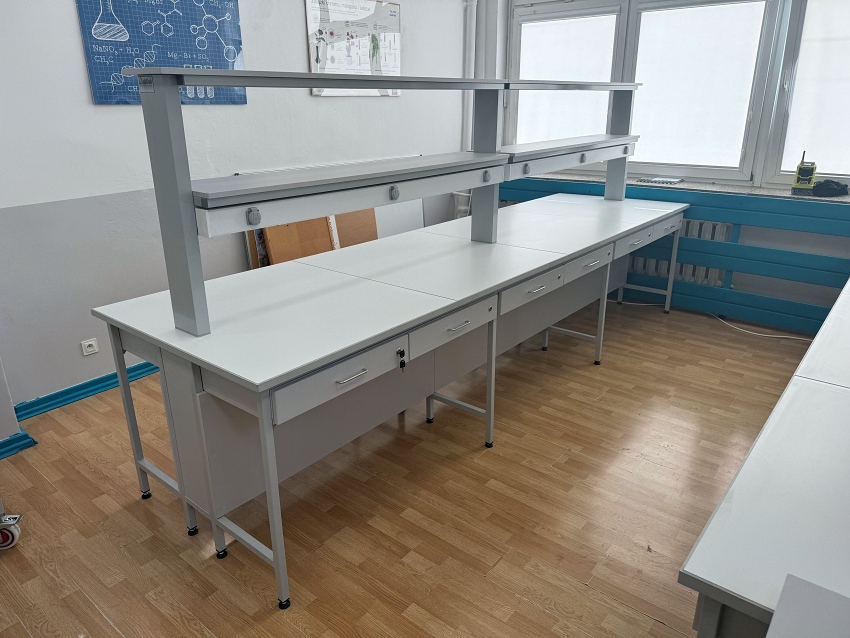 - Stół laboratoryjny wyspowy 14-osobowy z nadstawką do szkolnej pracowni chemicznej.