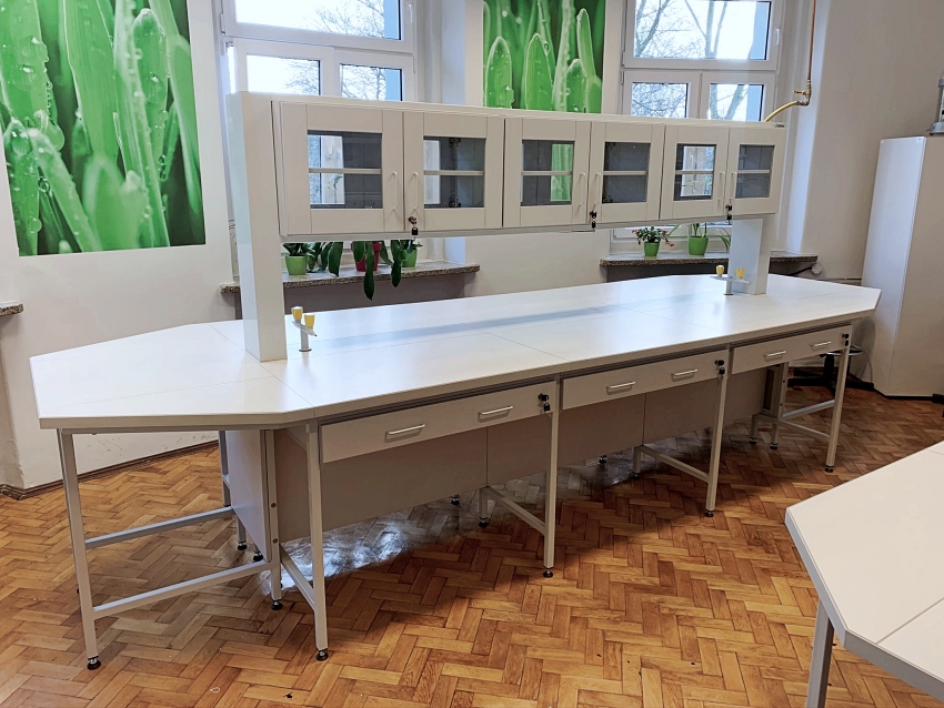 - Stoły laboratoryjne wyspowe 12-osobowe do szkolnych pracowni chemicznych