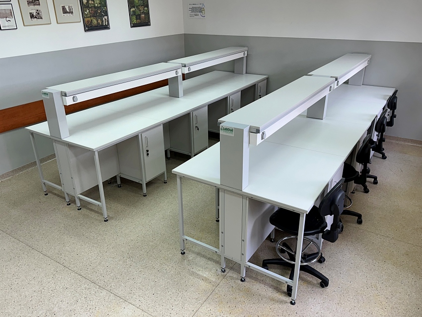 Stoły oparte są na solidnej konstrukcji/stelażu, wykonanym z profili stalowych malowanych proszkowo farbą epoksydową, od dołu zakończonym stopkami poziomującymi. Blaty robocze stołów dopasowane są do rodzaju substancji chemicznych używanych w pracowni. Szafki oraz szuflady wykonane z laminatu o wzmocnionej strukturze z okleiną PCV 2mm, zamykane na zamki patentowe. Szafki wyposażone w system cichego domyku. Szuflady wysuwane na prowadnicach.