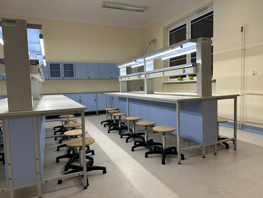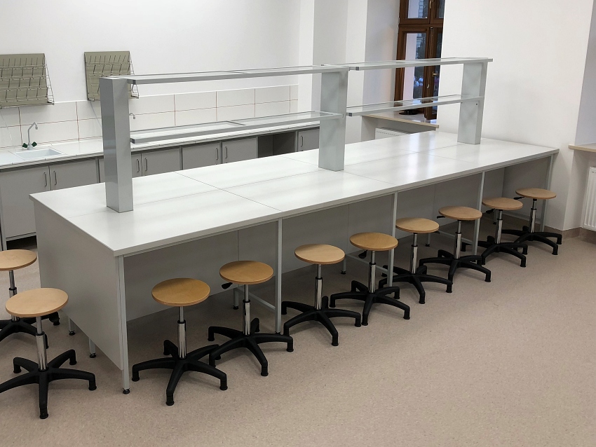 - Stoły laboratoryjne wyspowe 14-osobowe do szkolnej pracowni chemicznej