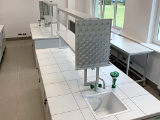 Przykładowe wyposażenie: zlew ceramiczny, bateria laboratoryjna c/z woda, oczomyjka kranowa.