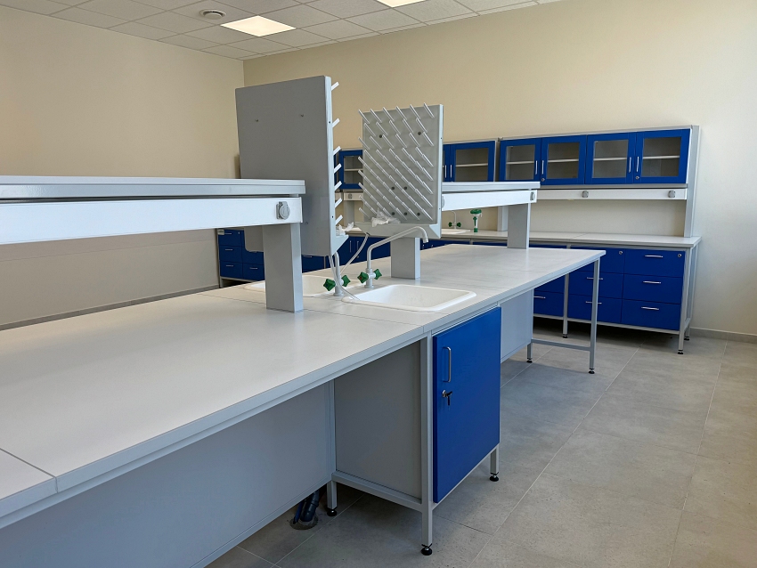 Przykładowe wyposażenie: baterie laboratoryjne wody, zlewiki, podwójne zawory gazu, oczomyjka.
