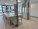 Stoły wyspowe do pracowni chemicznych wyposażone w instalacje wody, gazu, nadstawki, gniazda elektryczne.