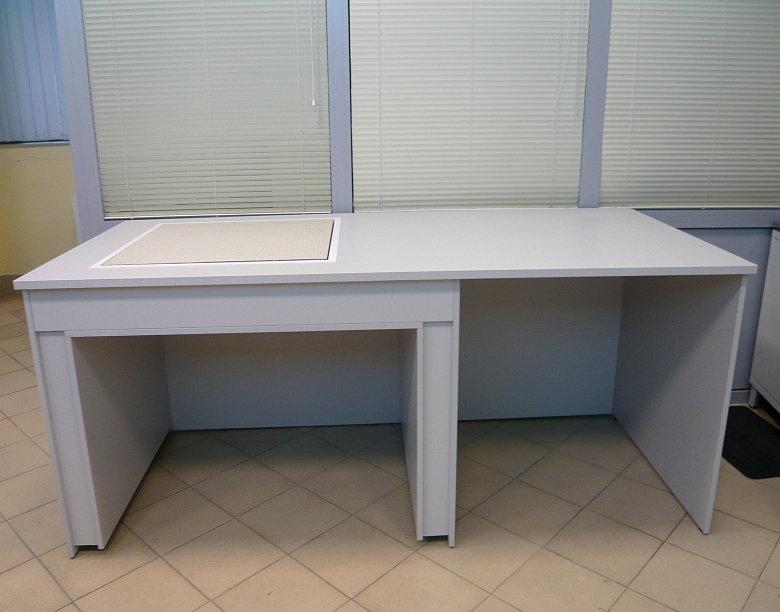 Płyta wagowa antywibracyjna umieszczona w blacie stołu laboratoryjnego. Zainstalowana na plastycznych elastometrach w dodatkowym wzmocnionym i stabilnym stalowym stelażu. Stelaż posiada niezależny system poziomowania w zakresie od 0-40mm. Blat stołu oraz płyta wagowa wykonane z tego samego materiału: konglomeratu kwarcowego.