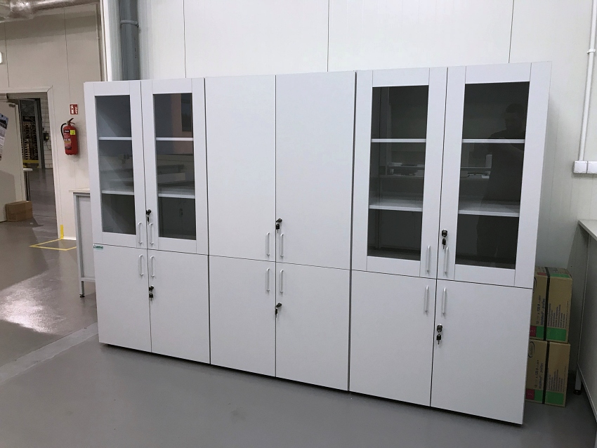 Szafy laminowane pełne można wykorzystać do przechowywania sprzętu laboratoryjnego i dokumentacji, natomiast szafy z drzwiami przeszklonymi do przechowywania szkła laboratoryjnego.