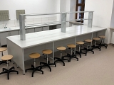 Stoły laboratoryjne wyspowe do szkolnych pracowni chemicznych. Przeznaczone do przeprowadzania doświadczeń. Stoły z dużą powierzchnią roboczą. Zabudowane w całości szafkami, z miejscami siedzącymi.